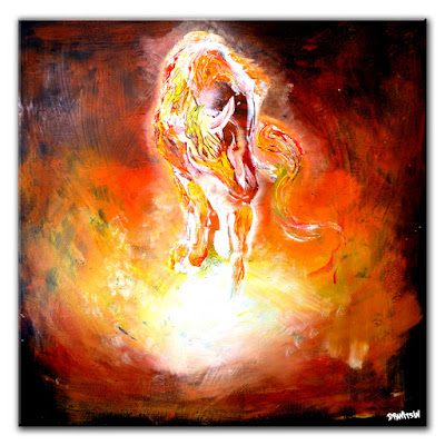 Hey guys! This is Peter Dranitsin and the painting is called "Inferno". In this short art tutorial I will explain and show you how to create this breath taking abstract painting of a fire and a horse. I start off with black canvas 36"x36". The colors I chose for this painting are white, bright yellow, dark yellow, orange, bright red and black (the initial canvas color). The way I place the colors on canvas is starting off with white in the center I gradually work my way and adding colors in order of their lightness and brightness. So around the white goes bright yellow, then orange, and red, leave off the black around the bright colors. I use brush to spread the paint and as soon as I am finished I begin to outline the fire horse starting off with white. After your outline is done go ahead and start adding colors using your small spatula. Add same colors as you did for the background. This is really amazing painting to create for a gift to your family or friends or just hang it above your fireplace. It will add color and brightness to any room!